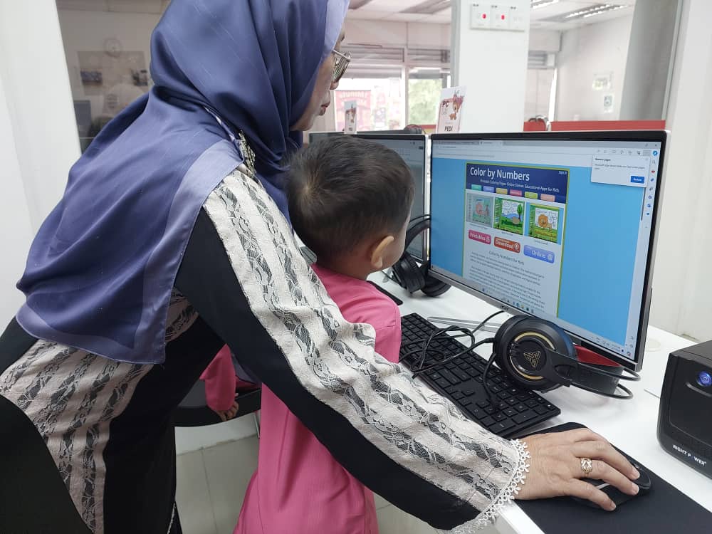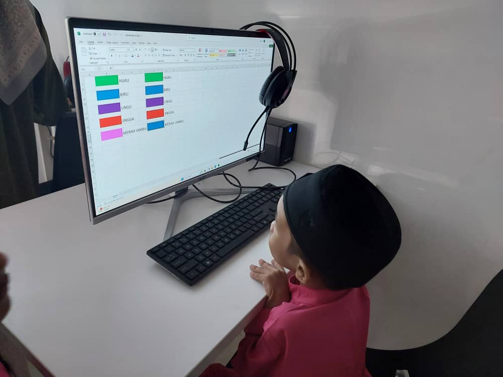 Membantu pelajar Tabika Kemas FSK belajar mewarna kotak menggunakan Microsoft Excel.